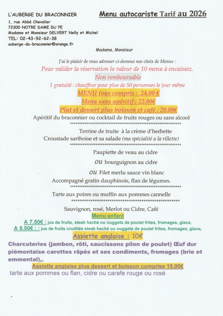 Pour toutes précisions ou demande particulière vous pouvez nous contacter : contact@aubergedubraconnier.fr ou