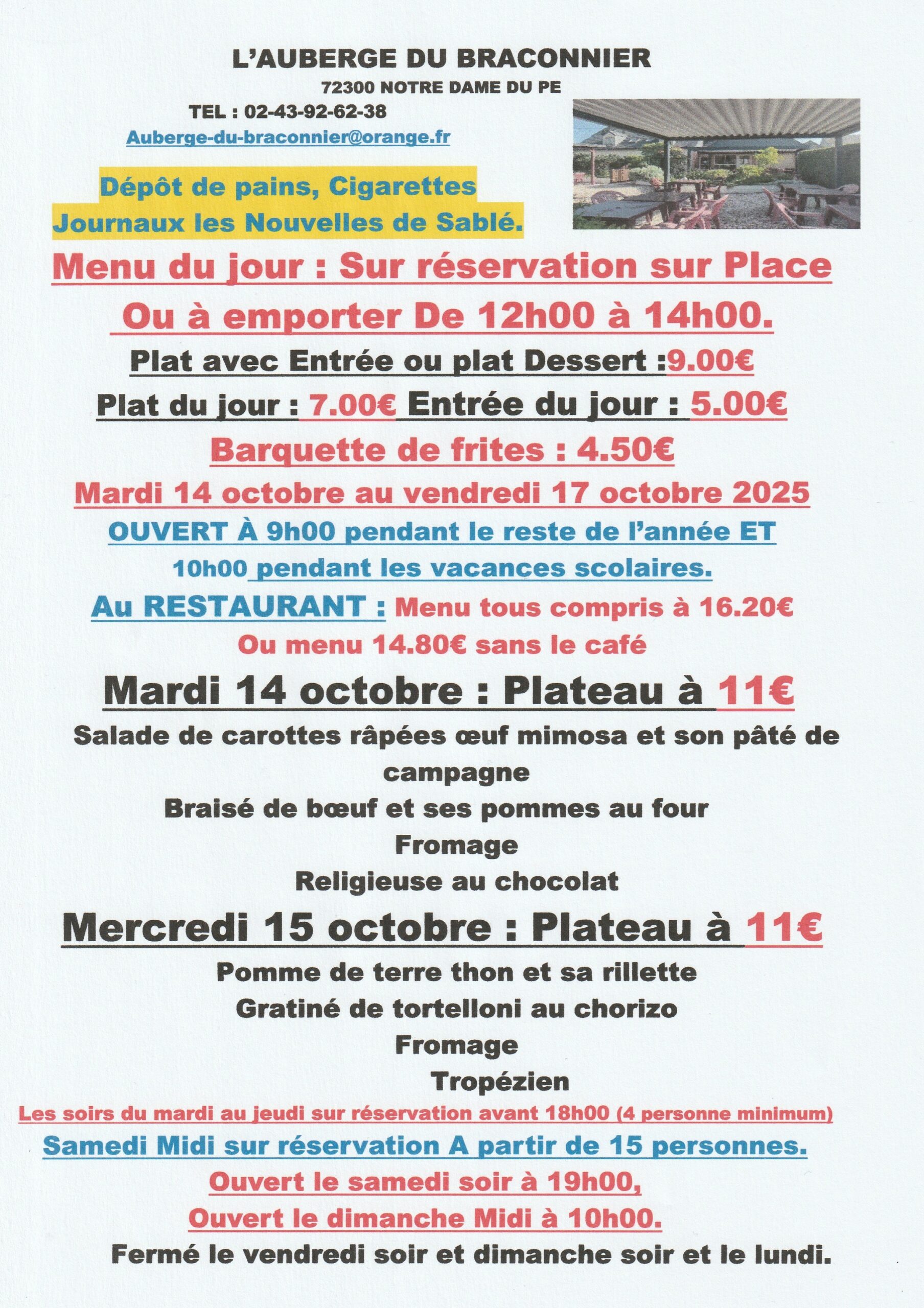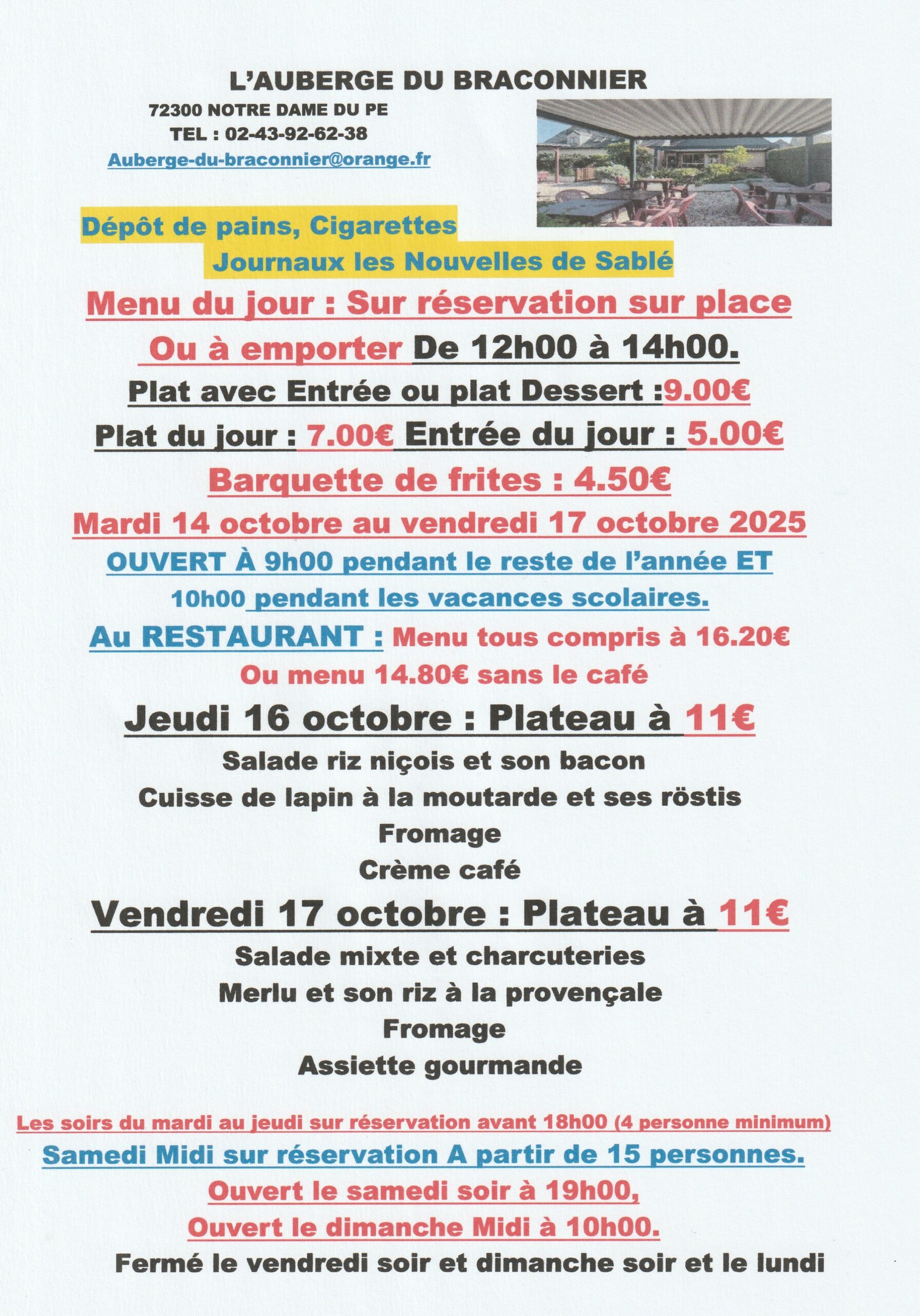 Dépôt de pains, Cigarettes journaux les Nouvelles de Sablé Sur Réservation De 12h00 à 13h30.